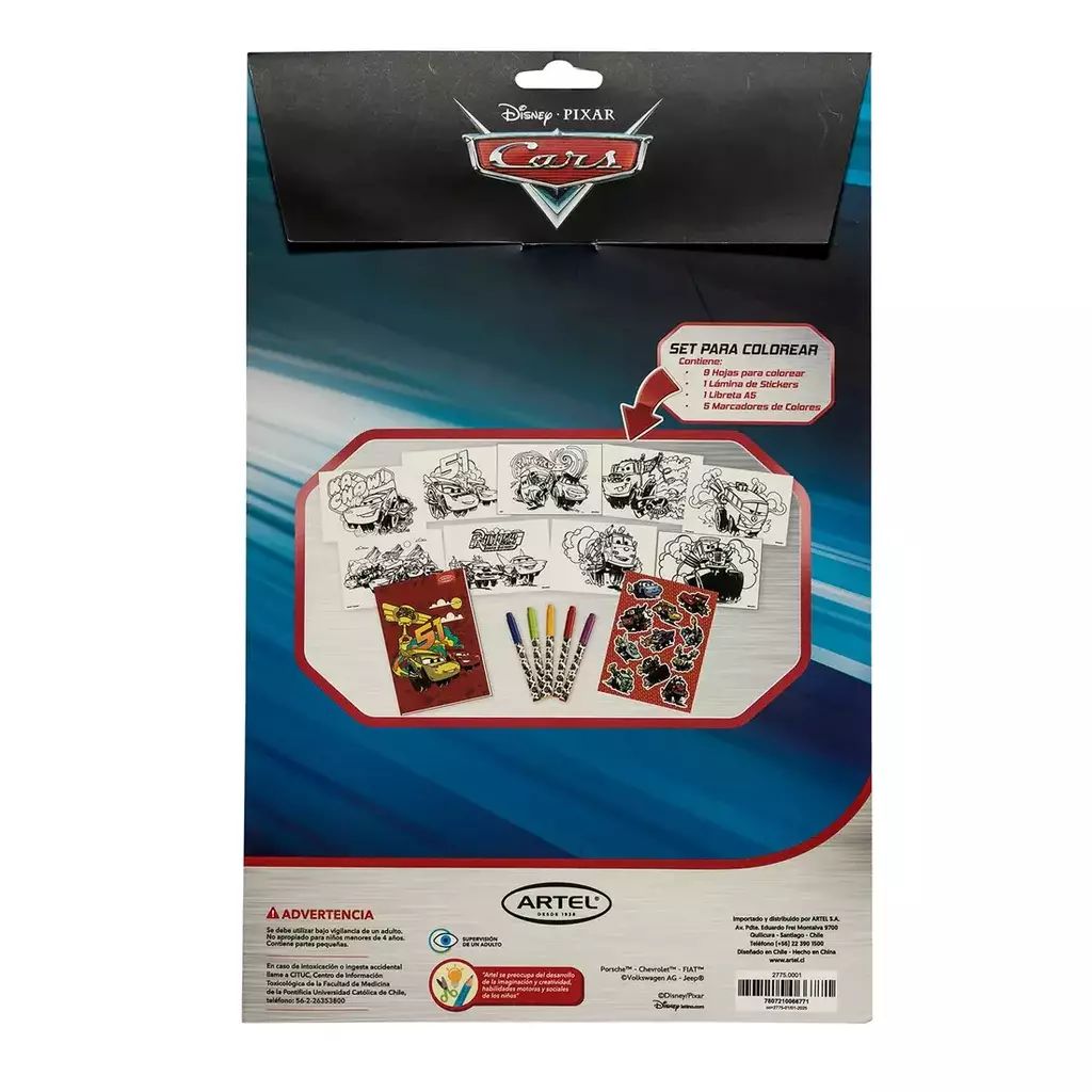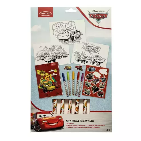 ¡A toda velocidad con el "Set para colorear Cars"! Prepara tus motores para una explosión de color con Rayo McQueen y sus amigos. Este kit de arte de Cars incluye 9 láminas para colorear llenas de acción, 1 lámina de stickers para personalizar, 1 mini libreta A5 para tus diseños de carreras y 5 marcadores vibrantes. Ideal para desarrollar la creatividad, la coordinación mano-ojo y el amor por los coches en los pequeños. ¡La diversión nunca se detiene!